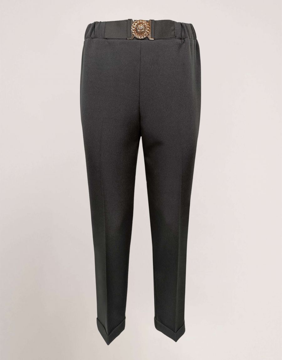 Pantalone in bistretch con risvolto, cinturina in canneté e fibbia oro