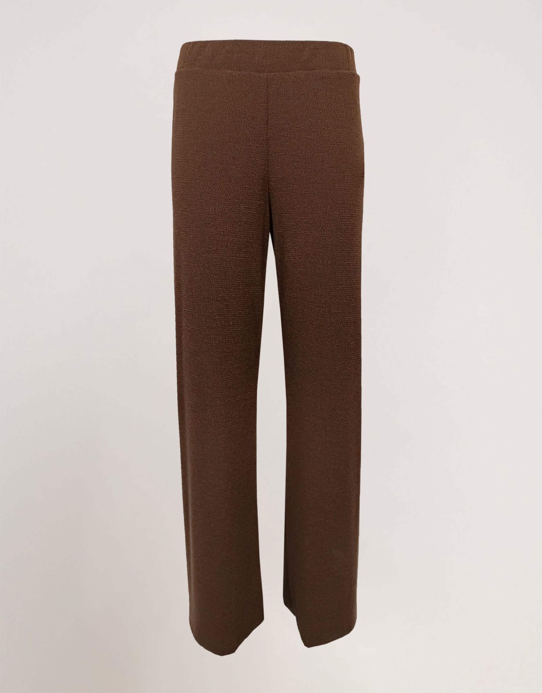 Questi pantaloni palazzo offrono una silhouette fluida ed elegante, realizzati in un raffinato tessuto ammagliato operato che dona texture e struttura. Il cinturino elastico garantisce una vestibilità comoda e pratica. Perfetti per un look che unisce comfort e sofisticatezza.