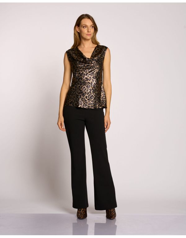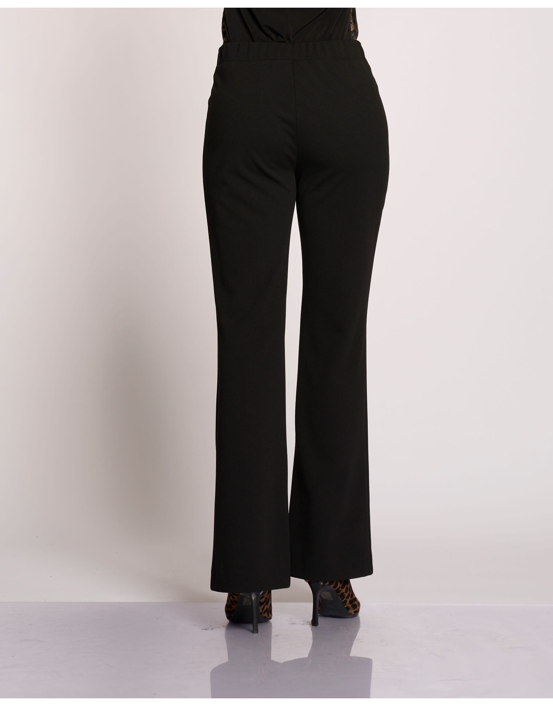 Questi pantaloni offrono una vestibilità moderna a zampetta, realizzati in tessuto scuba crêpe. Si distinguono per l'esclusivo dettaglio di cintura, realizzato in scuba pelle, e completato da una fibbia decorativa, che aggiunge un dettaglio raffinato e un tocco di contrasto.