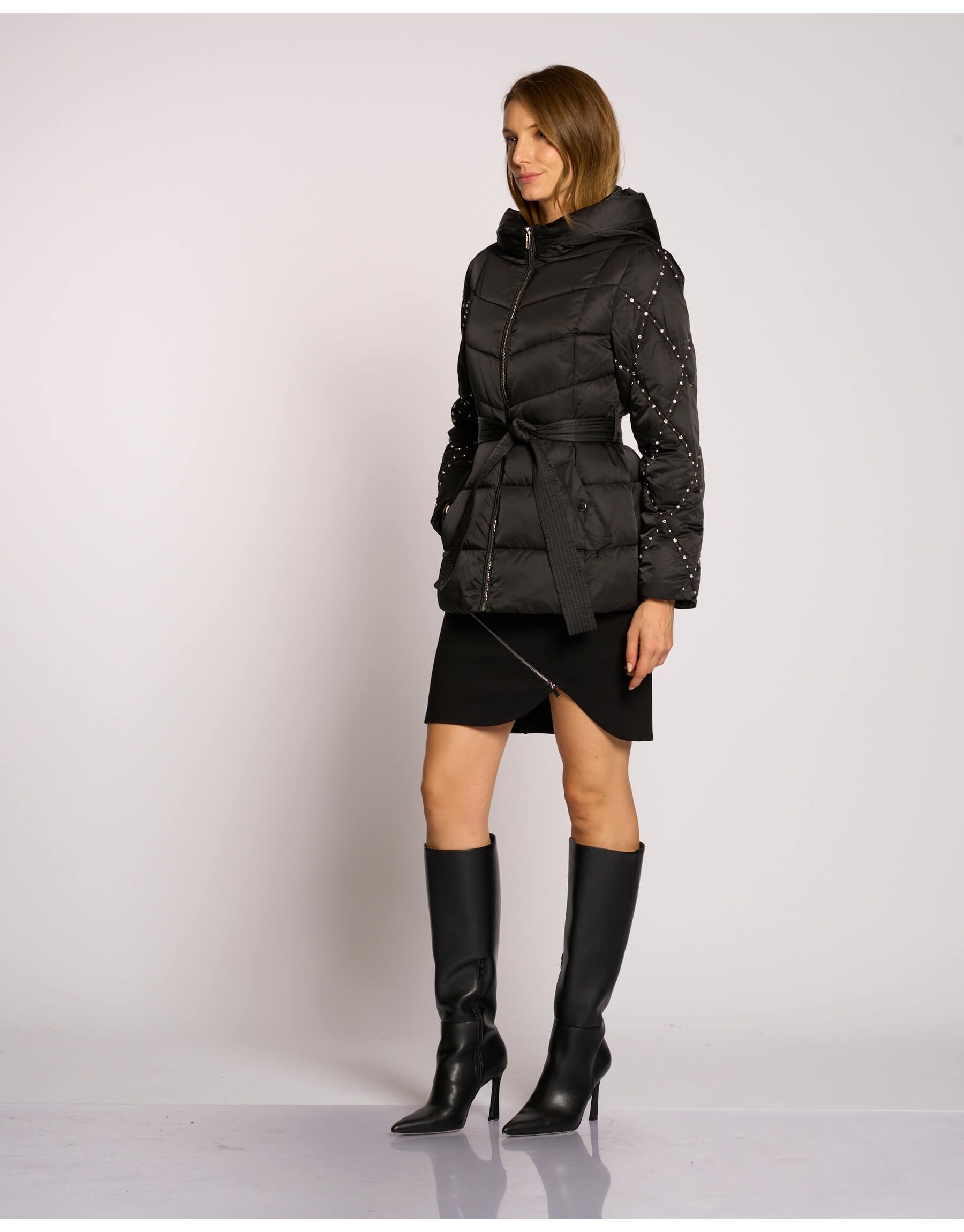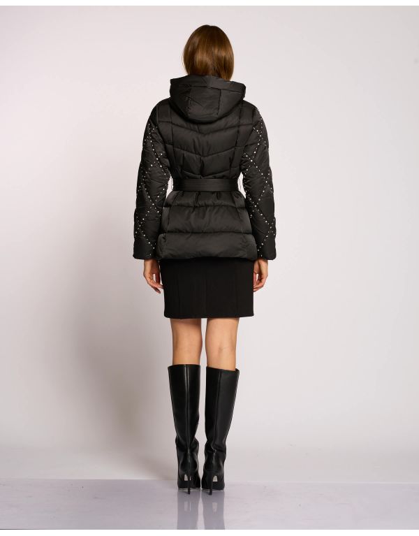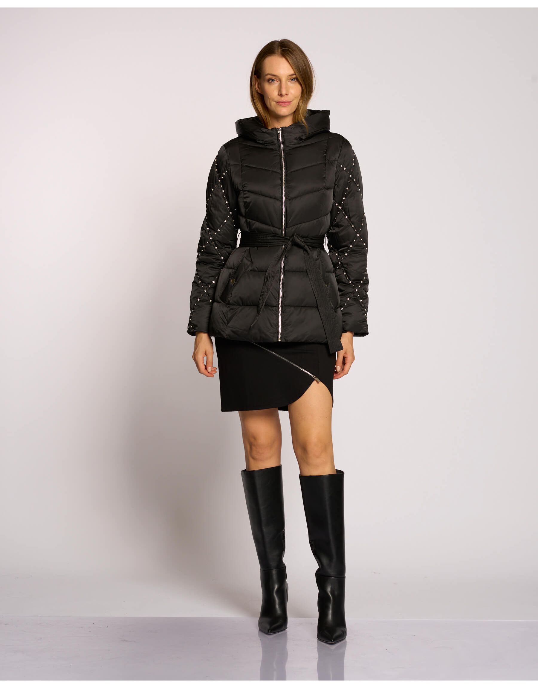 Piumino imbottito con diamanti sulle maniche, cappuccio e cintura