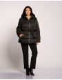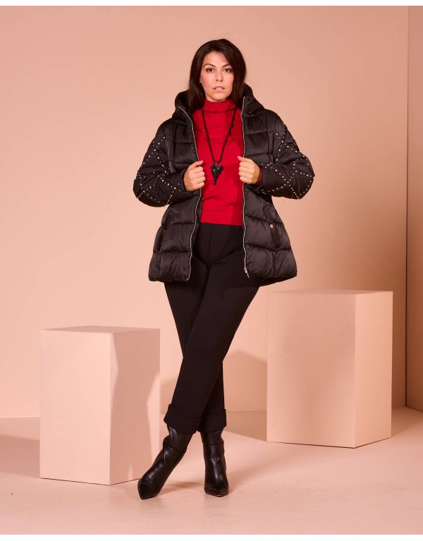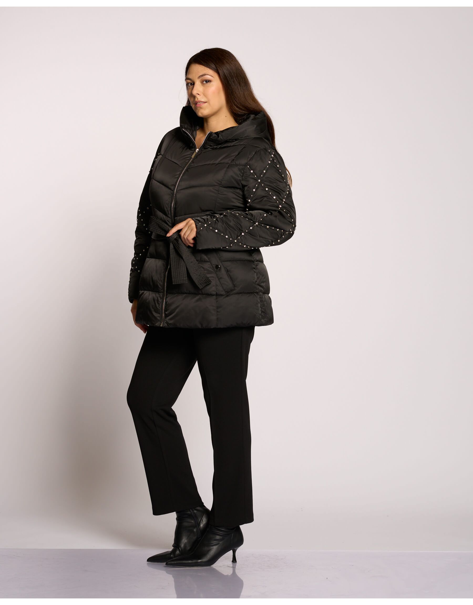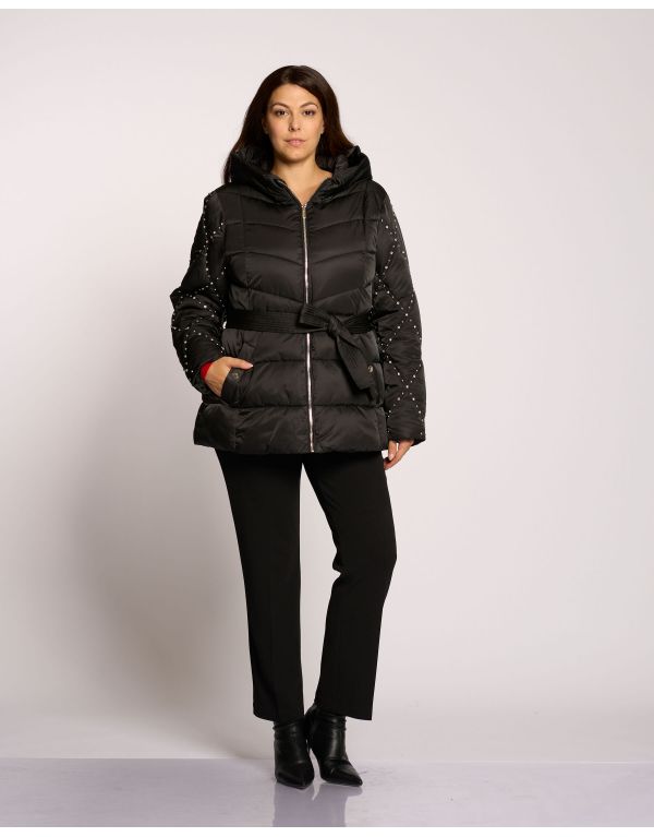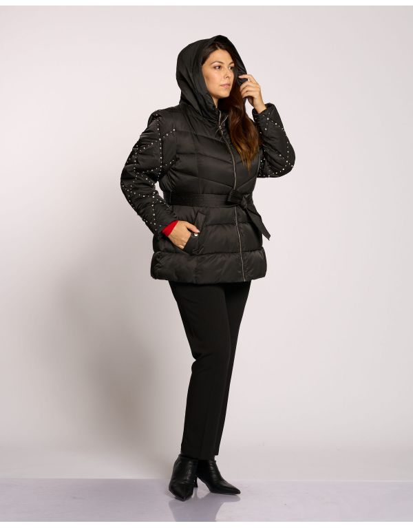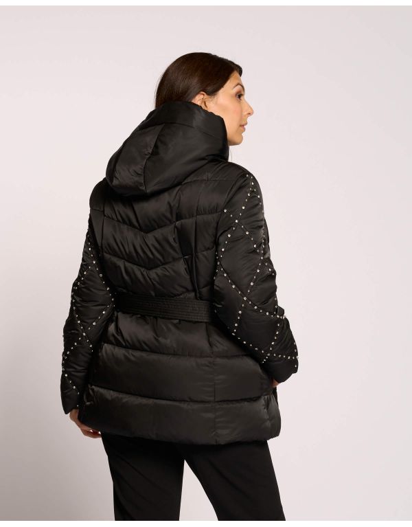 Piumino imbottito con diamanti sulle maniche, cappuccio e cintura