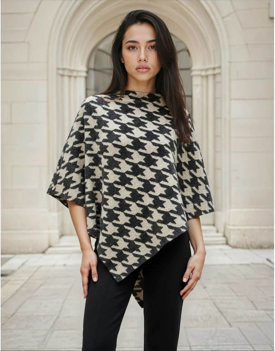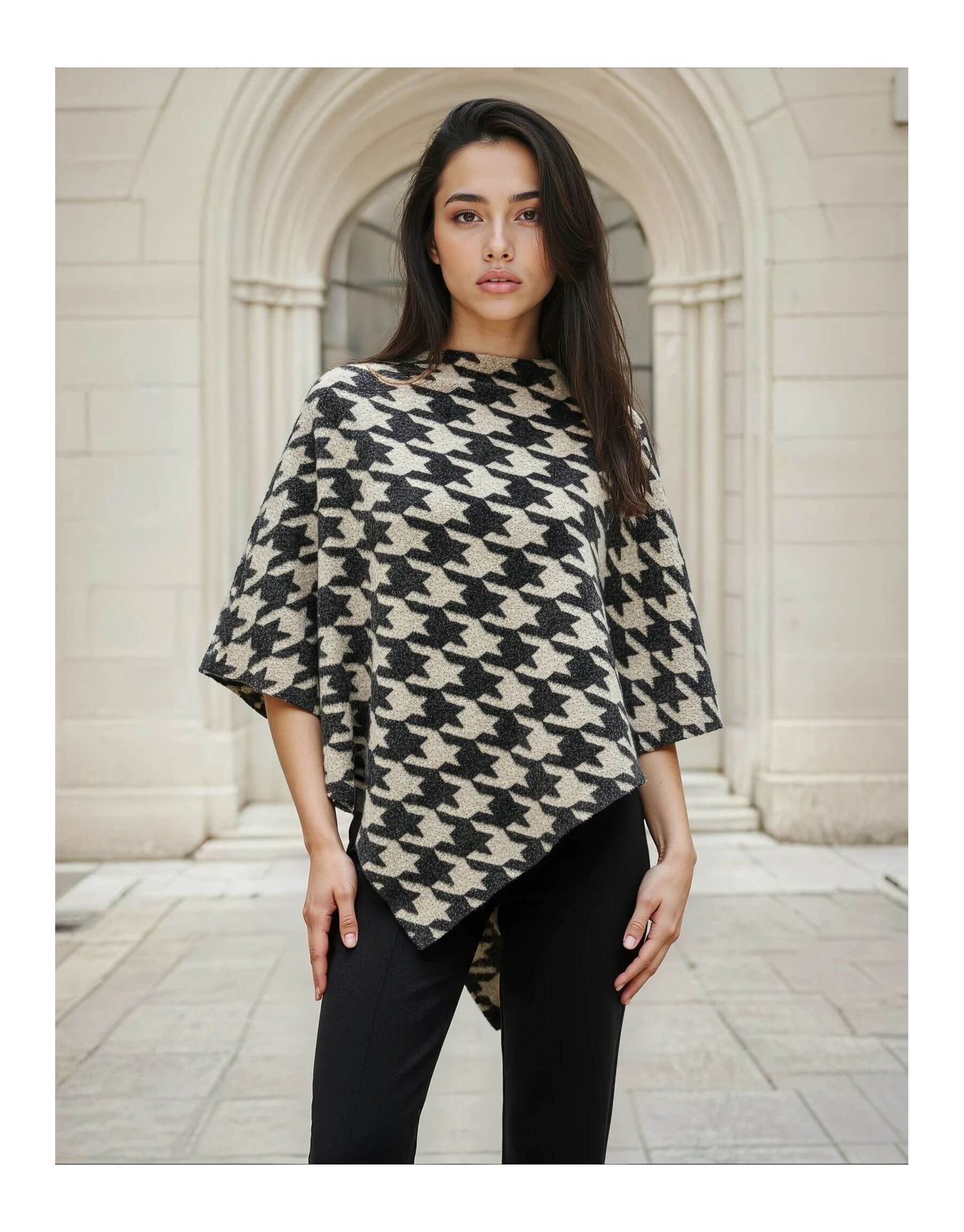 Poncho in maglia jacquard dal design sofisticato, arricchito da un elegante motivo a pied de poule. Un capo versatile e avvolgente, perfetto per aggiungere un tocco di stile e calore a ogni look.