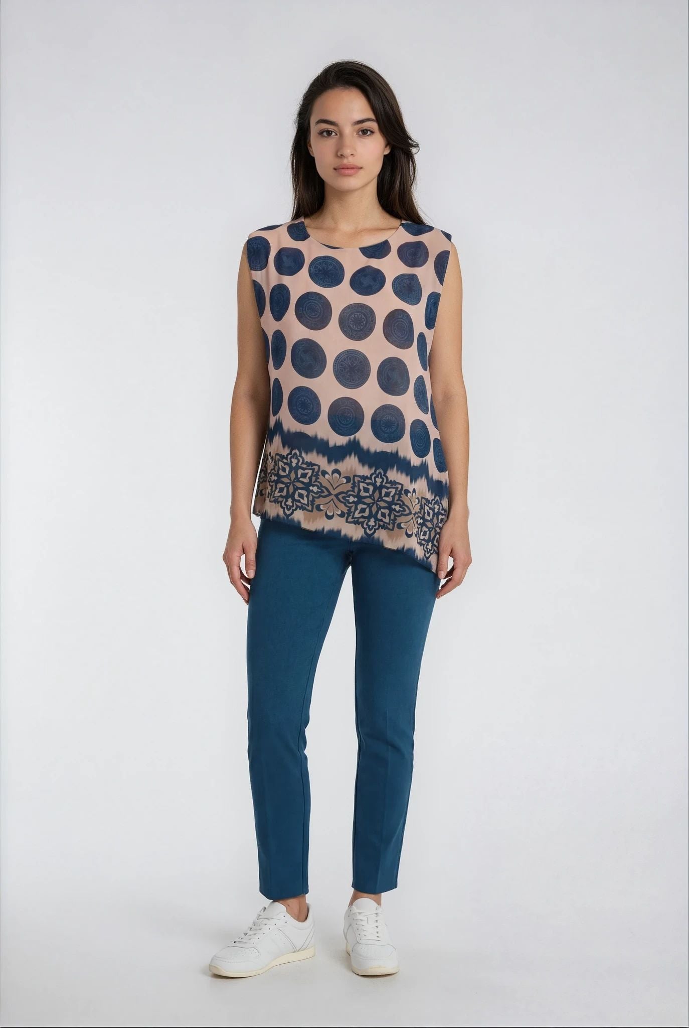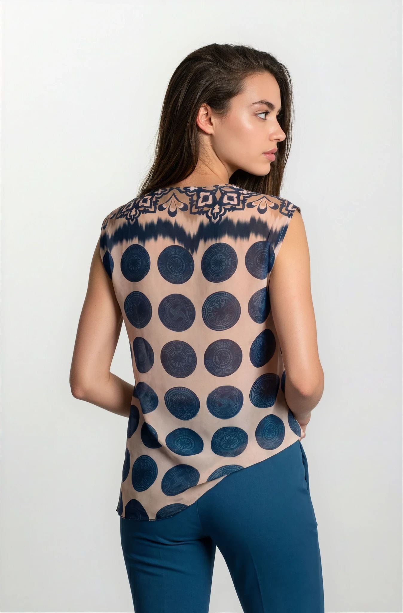 Top in georgette stampata con abbassamento e fondo asimmetrico