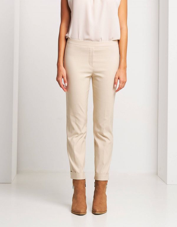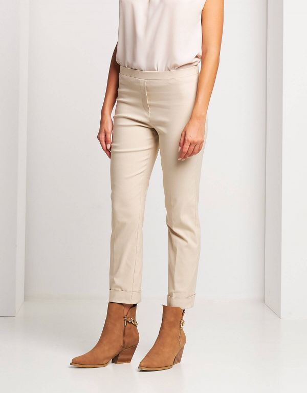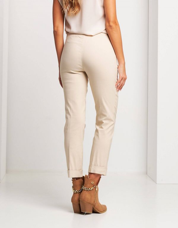 Questi pantaloni in bengalina offrono una vestibilità confortevole grazie all'elastico in vita, abbinando praticità e stile. Il risvolto sul fondo aggiunge un tocco casual e curato, rendendoli versatili per diverse occasioni.