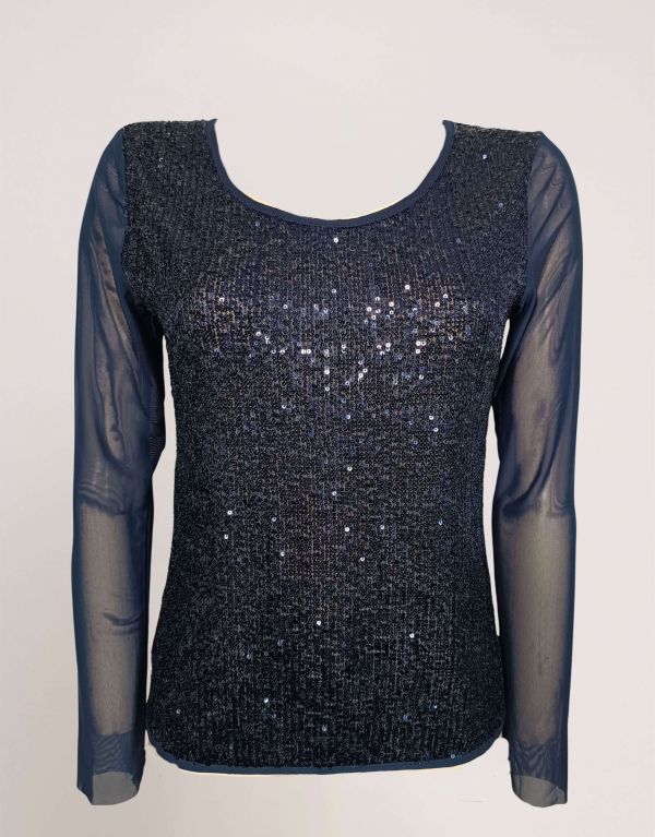 Questa T-shirt unisce due stili in un unico capo. La parte frontale è completamente ricoperta di paillettes scintillanti, mentre il retro e le maniche sono realizzati in mesh trasparente, per un tocco audace e contemporaneo. Ideale per le serate in cui vuoi brillare.