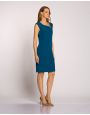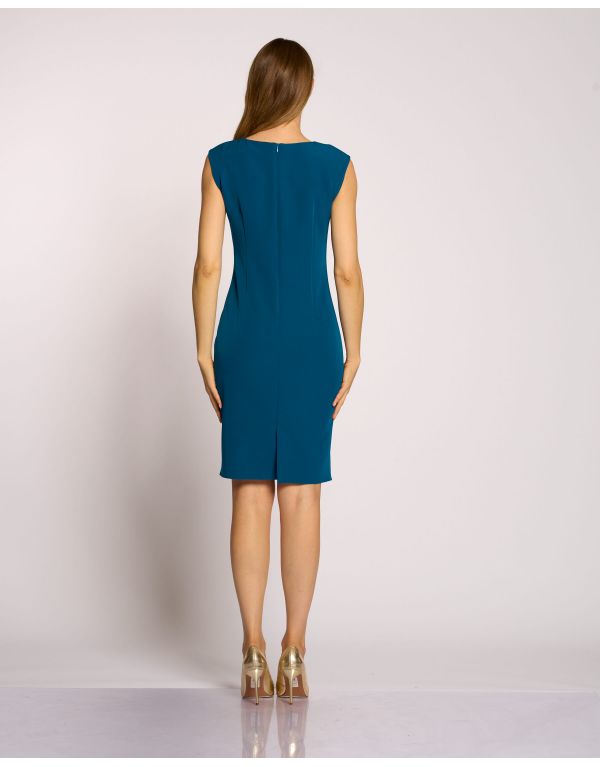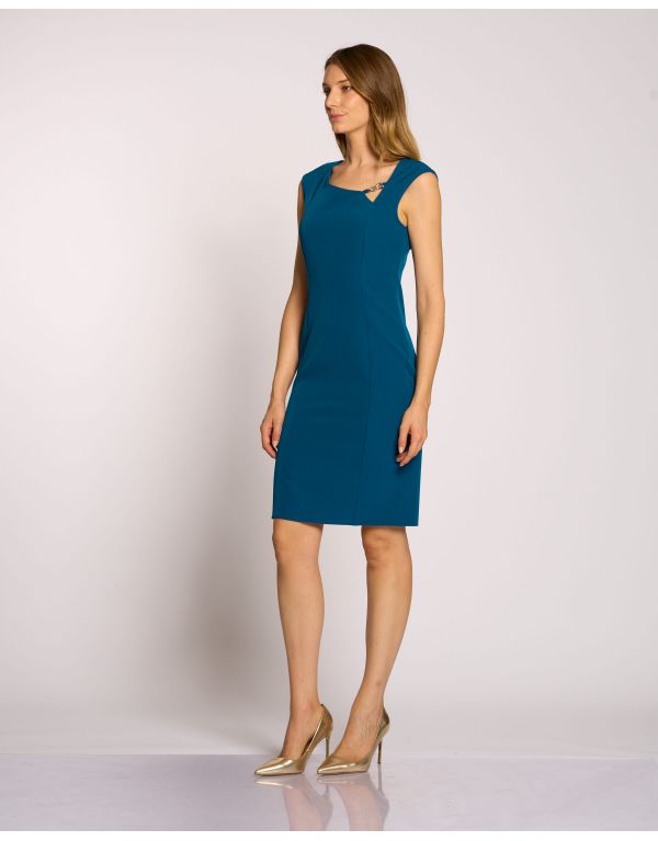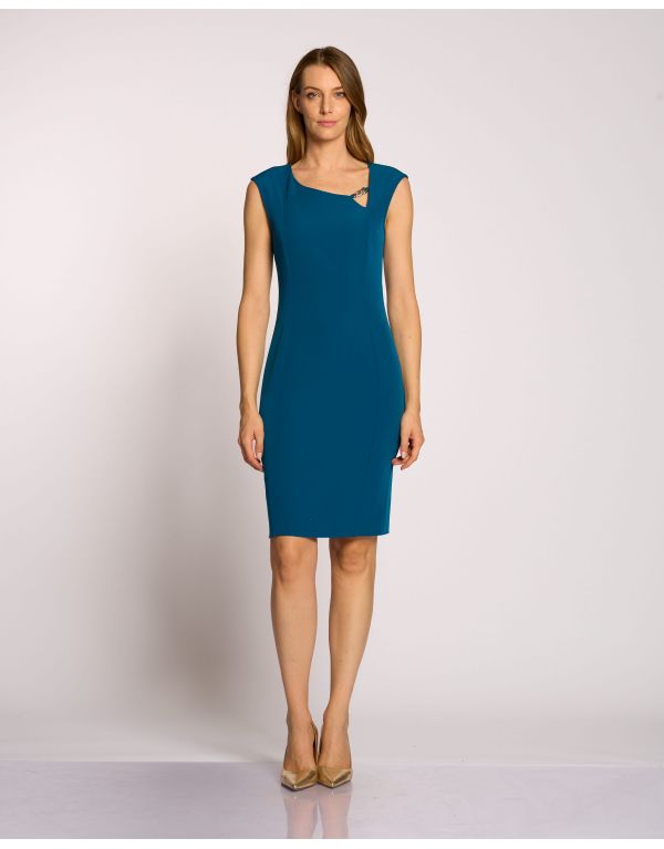 Tubino in bistretch con scollo asimmetrico e accessorio argento