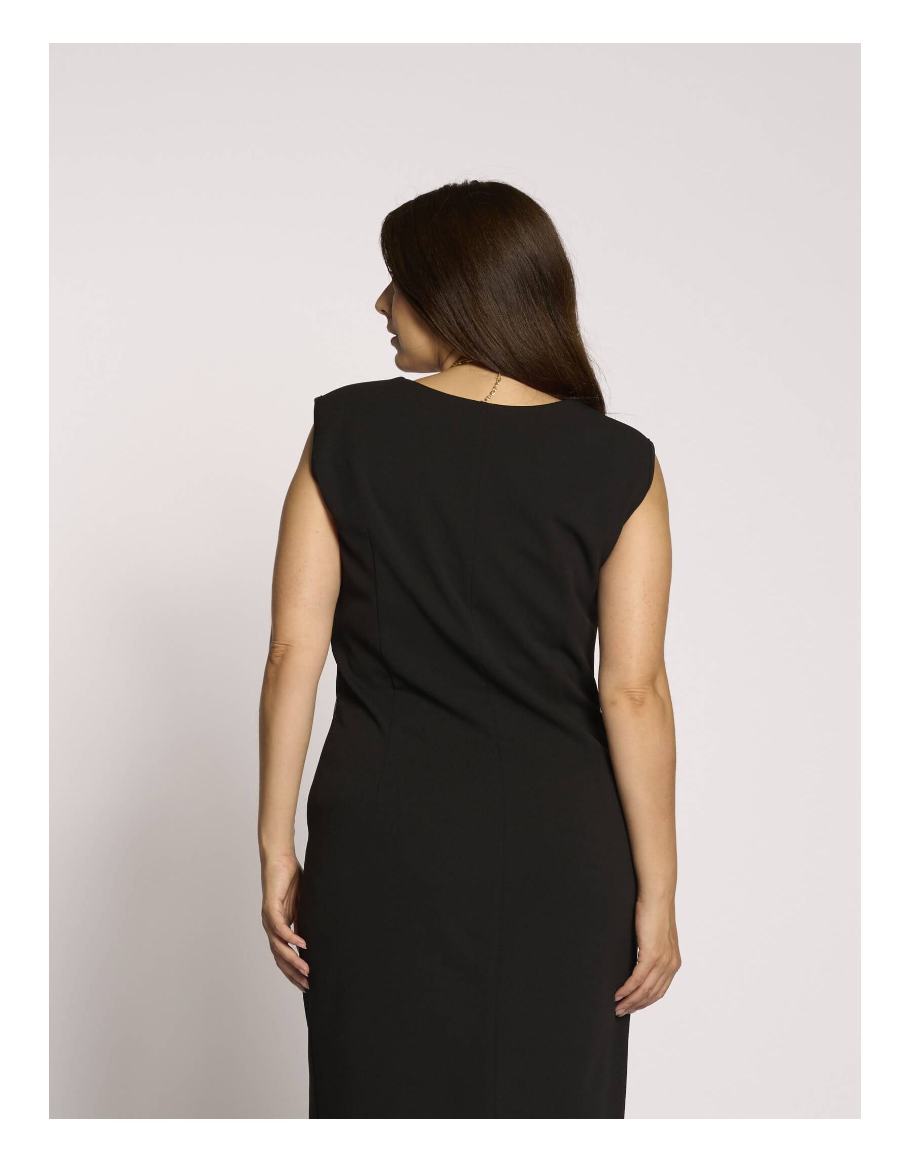 Questo tubino bimaterico unisce due tessuti distinti: il crêpe scuba per una vestibilità fluida e confortevole e la pelle scuba per un tocco moderno e strutturato. L'accostamento di questi materiali crea un capo dal design sofisticato e versatile.