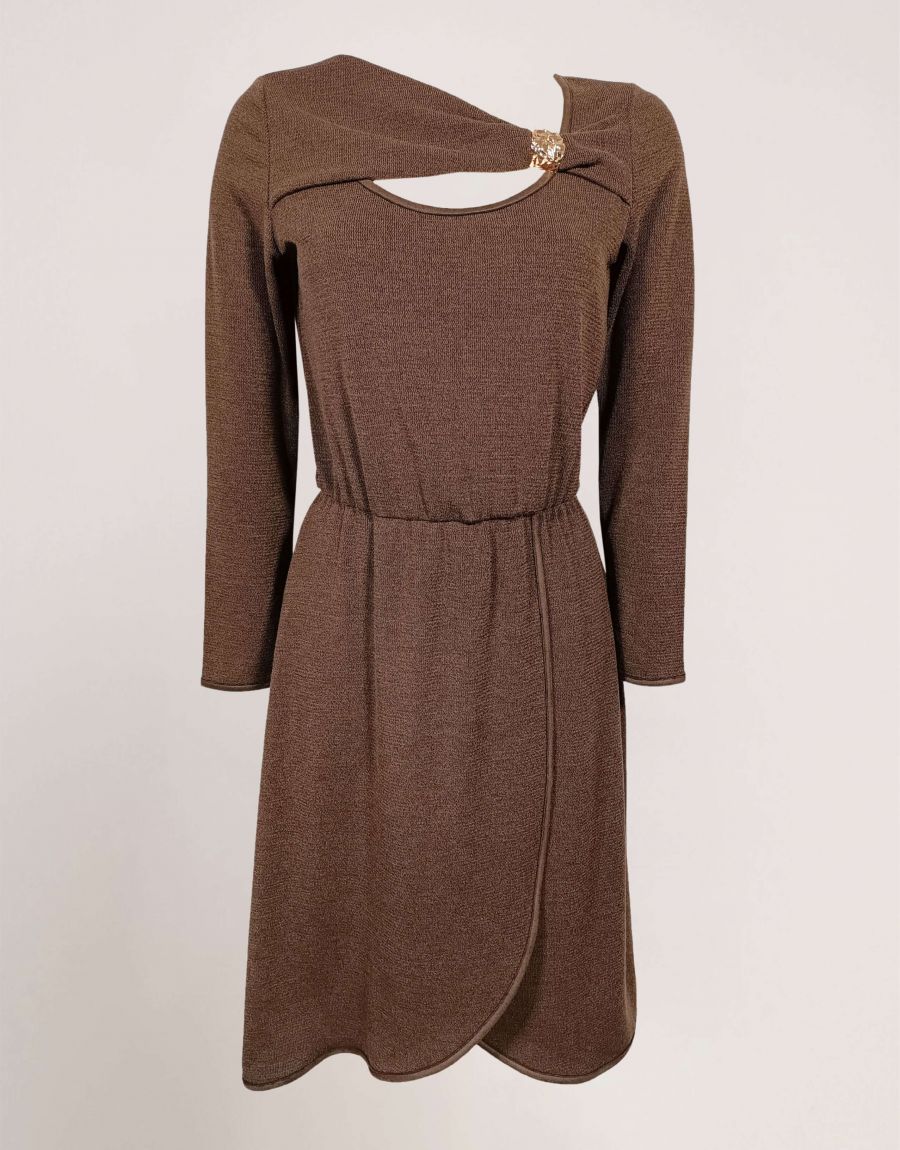 Vestito in tessuto di maglia con scollo rotondo in scuba pelle e drappeggio con nodo oro