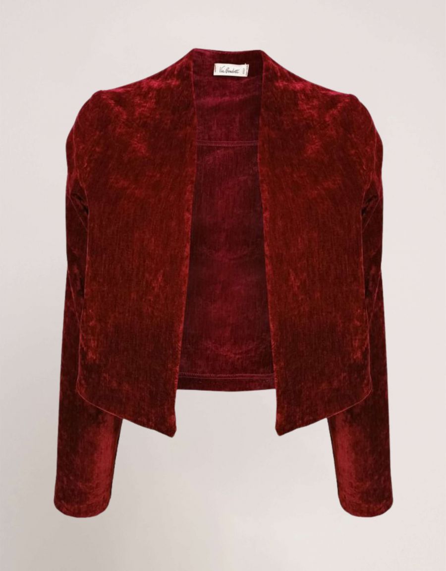 Questa giacca corta in velluto è il capo ideale per aggiungere un tocco di lusso e texture al tuo outfit, caratterizzata dal design aperto che la rende versatile e facile da abbinare.