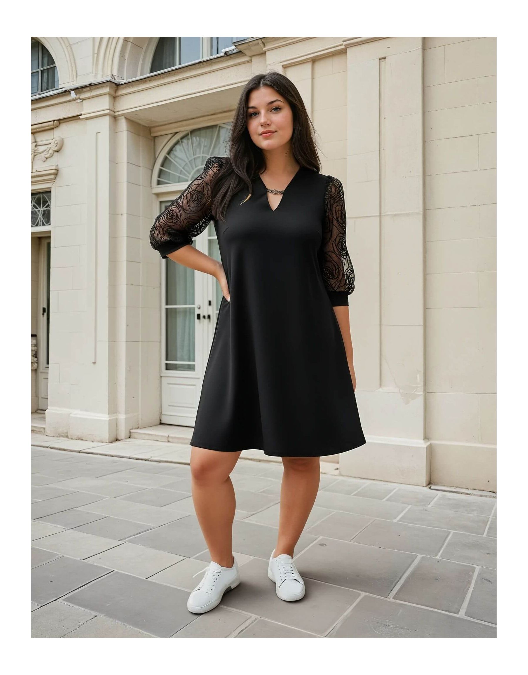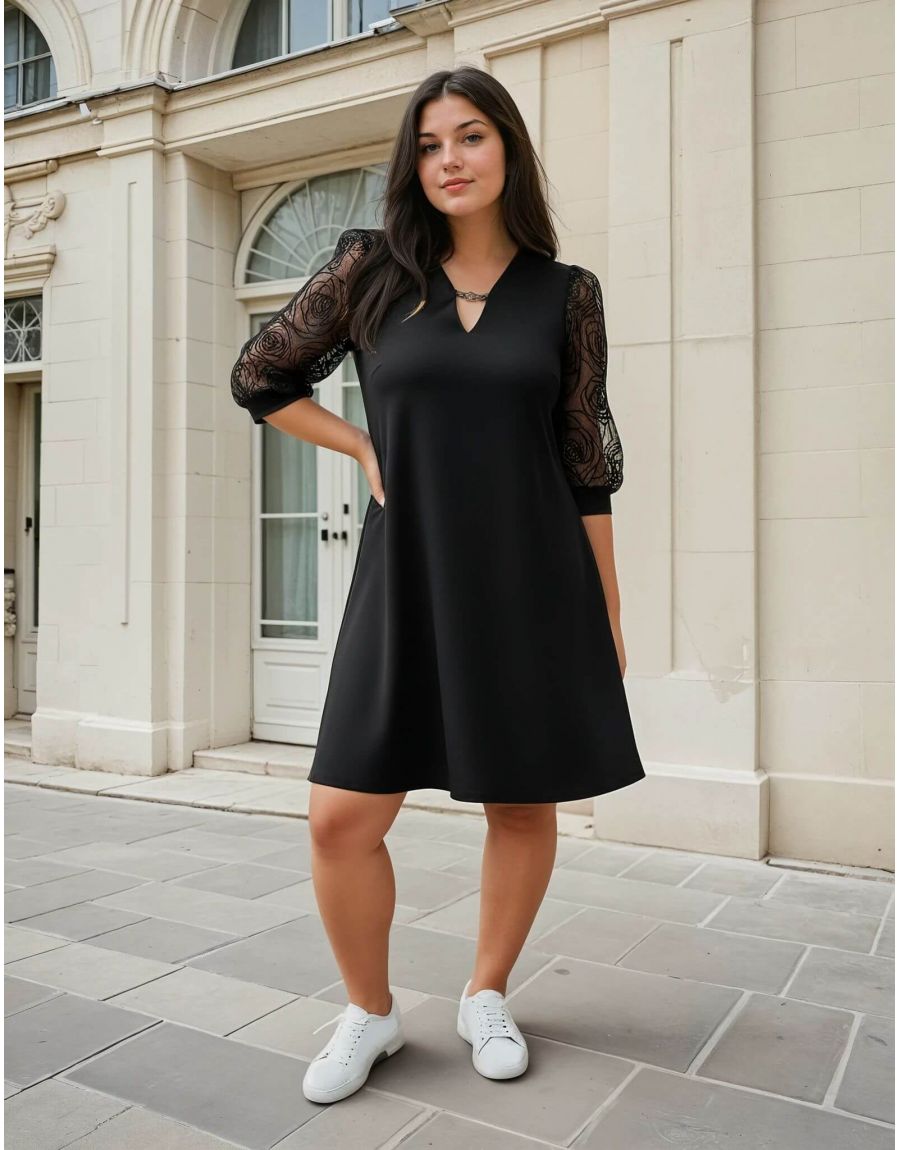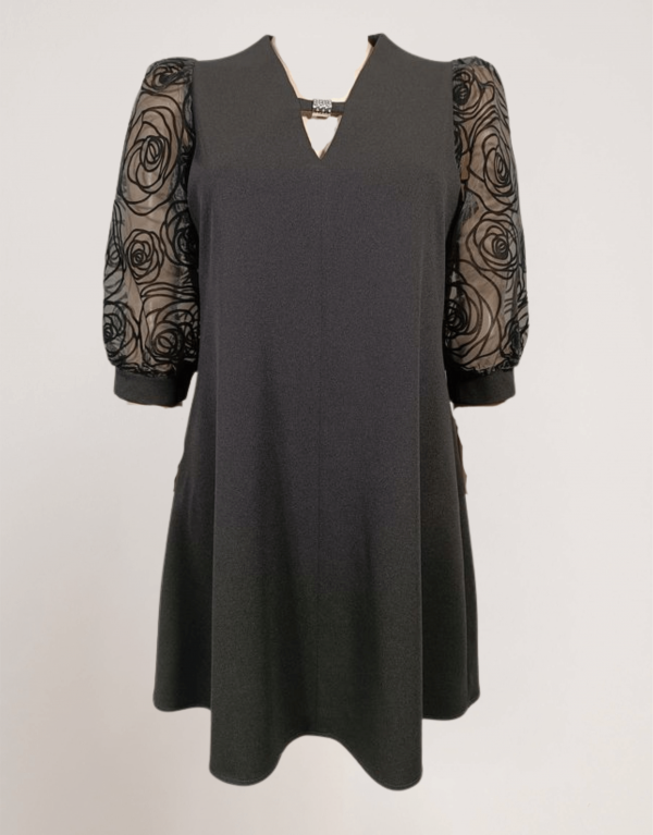 Vestito svasato in scuba crêpe con gioiello sullo scollo e maniche in organza floccata a rose