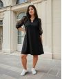 Un elegante vestito svasato realizzato in scuba crêpe, che offre una caduta impeccabile e strutturata; il capo è impreziosito da un raffinato dettaglio gioiello sullo scollo, mentre le maniche in organza floccata a rose aggiungono un tocco di trasparenza e romanticismo tridimensionale.